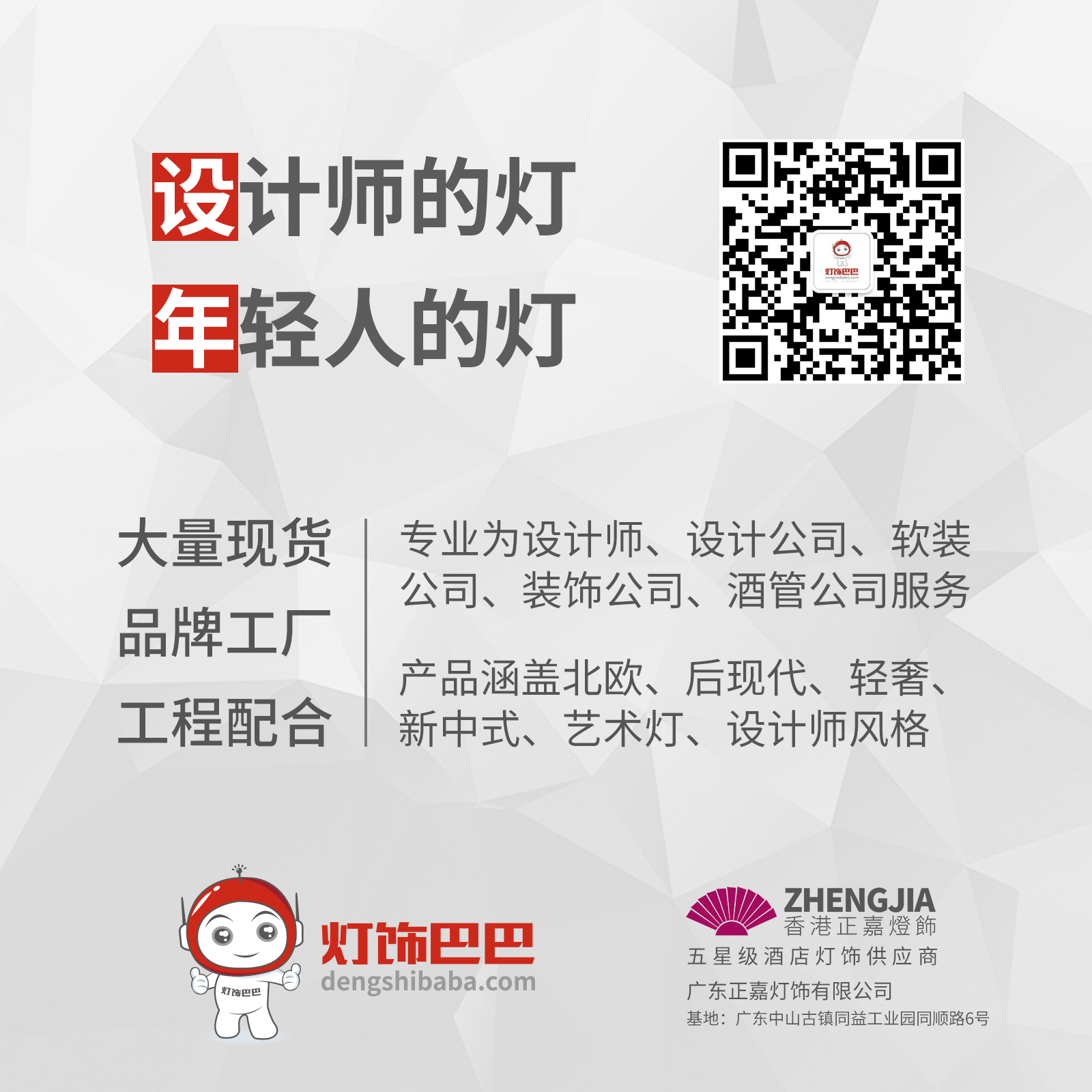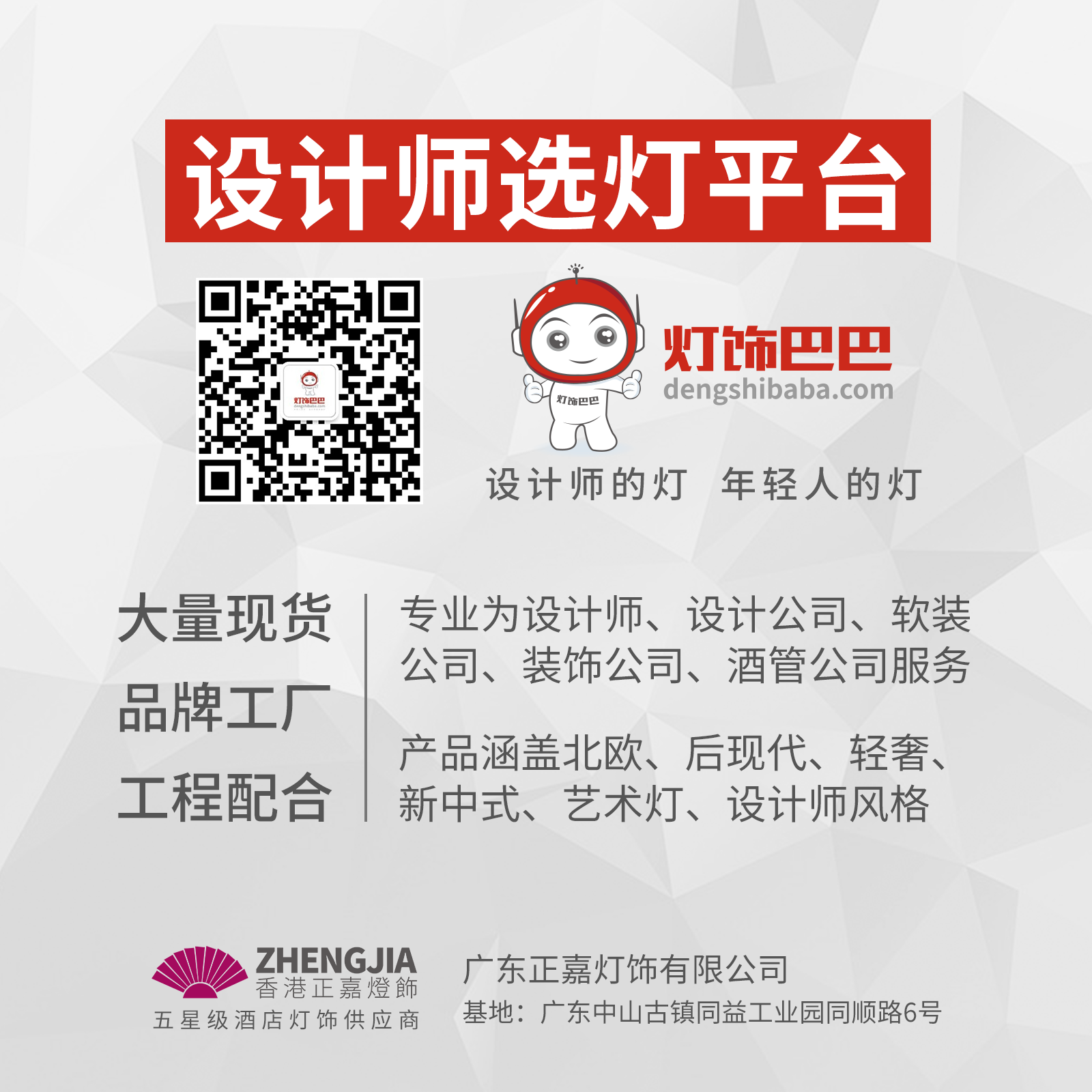 灯饰巴巴的后台工厂、联合创始人广东正嘉灯饰有限公司是一家集酒店灯饰、商业照明、户外亮化LED工程、灯光智能于一体的专业酒店别墅会所售楼处灯饰照明解决方案提供商,拥有20年灯饰行业设计及制造经验,生产基地座落于中国灯饰之都古镇,公司是国内外超千个星级酒店、别墅、会所、售楼处、样板房灯饰及照明工程的优质供应商!香港正嘉灯饰是商业照明品牌“雅马达照明”、户外亮化照明品牌“霍尔希姆”、景观灯品牌“乾基照明”、设计师软装公司服务品牌“灯饰巴巴"的股东;广东正嘉灯饰有限公司同时是拥有户外亮化双甲资质施工一级、照明设计甲级公司的股东。