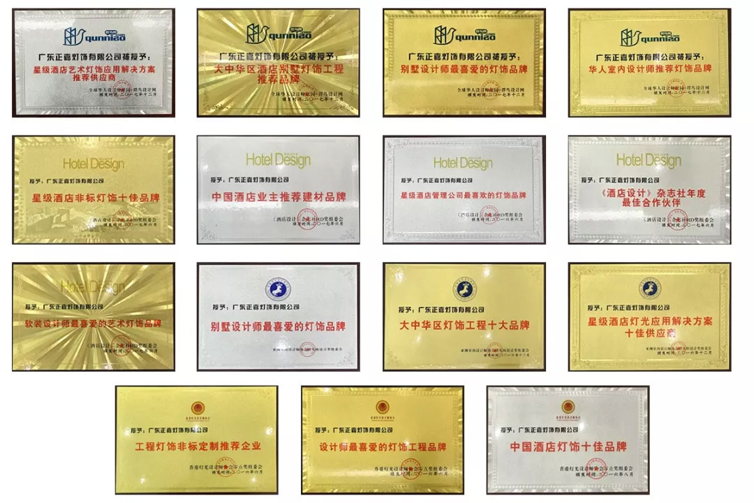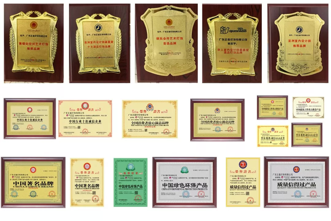 公司先后获得:中国著名品牌、质量信得过产品、中国绿色环保产品、全国消费者满意产品、中国行业十佳诚信企业、质量服务诚信AAA企业、中国建筑工程重点推荐产品、重合同守信用企业 、中国酒店灯饰十佳品牌 、设计师最喜爱的灯饰工程品牌 、大中华区灯饰工程十佳品牌、亚洲室内设计师推荐品牌、亚洲室内设计师最喜爱十大酒店灯饰品牌、星级酒店灯光解决方案十佳供应商、艾特奖大中华区最具影响力灯光设计机构、ISO9001:2000国际质量管理体系认证 、ISO14001环境管理体系论证、OHSASI8001职业健康体系论证、3C认证、欧洲CE认证、ROSH、FCC,IP68,检测报告认证等;公司同时拥有几十项实用新型专利、外观设计专利、软件著作权;